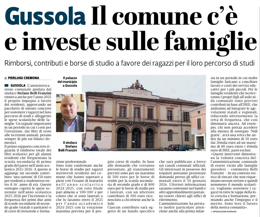Il Comune di Gussola, rinnova anche per il 2025 il proprio impegno a favore delle famiglie residenti, approvando un pacchetto di misure concrete per sostenere i ragazzi nel loro percorso di studi e alleggerire le spese scolastiche delle famiglie residenti.