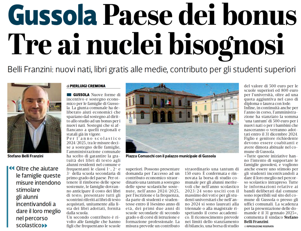 Nuove forme di incentivo e sostegno economico per le famiglie di Gussola
