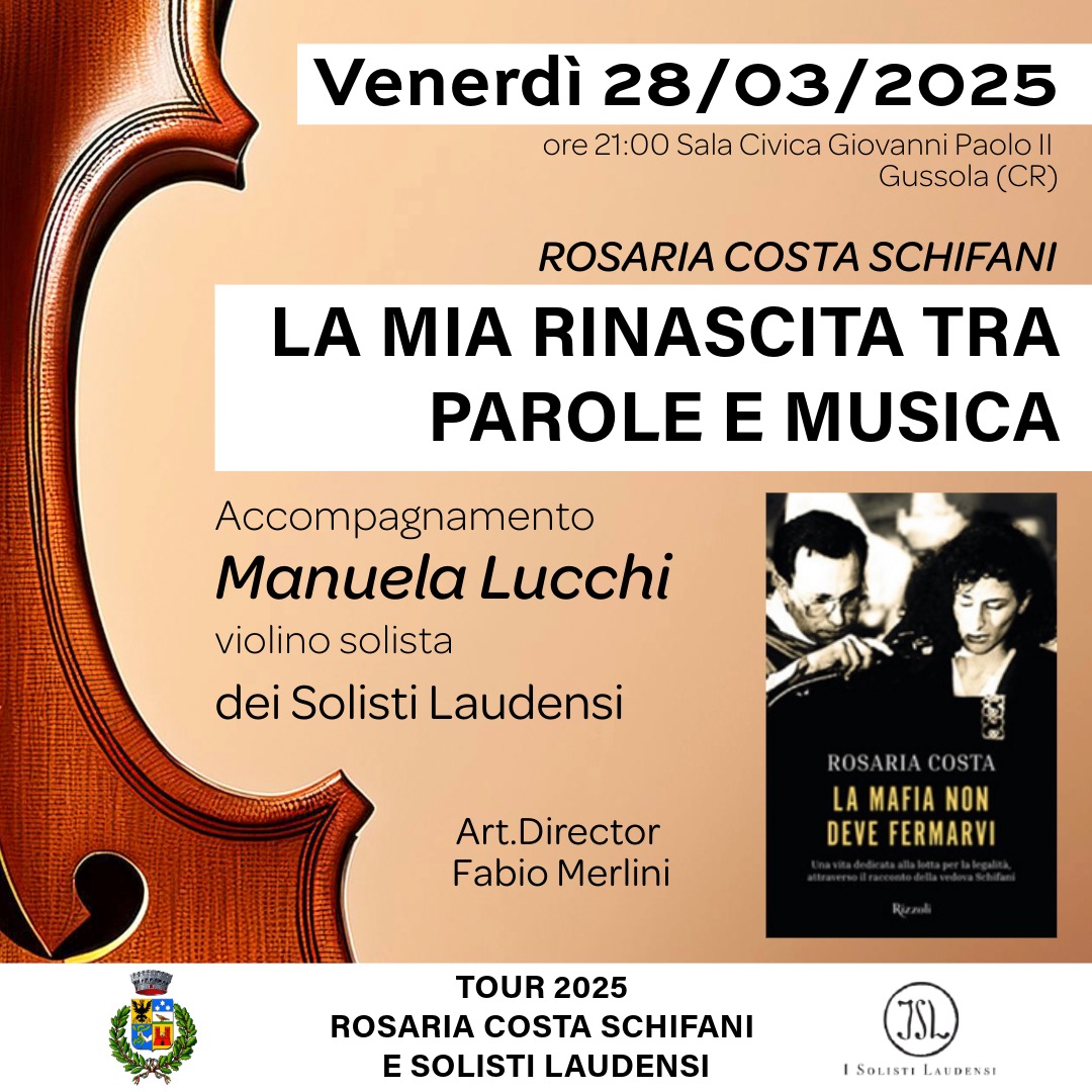 Ed è il monito che la donna porta in giro per l’Italia con una serata come quella vissuta venerdì a Gussola, in sala civica, che ha di fatto aperto a un nuovo progetto, di impegno civile e al contempo di cultura musicale. Ad accompagnare Costa Schifani, i Solisti Laudensi, che con una delle loro anime, Manuela Lucchi, hanno conosciuto 25 anni proprio la vedova di Vito Schifani e che in questo tour molto particolare festeggiano il 50esimo anno di attività. “Partendo da Gussola – ricorda Manuela Lucchi – perché è stato il primo comune ad aderire e dunque a credere in noi”.